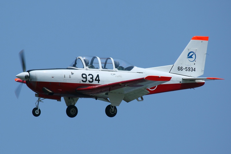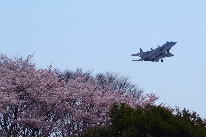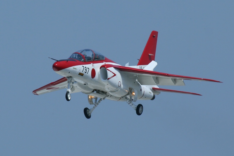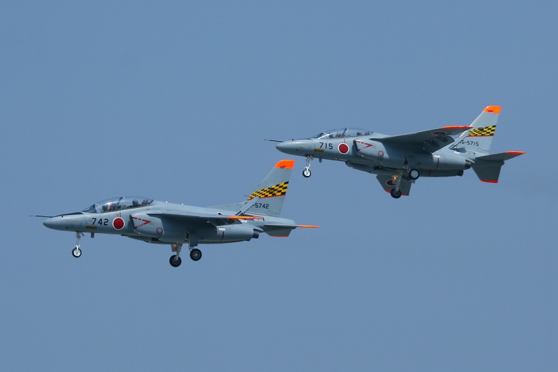 今日は教官のチェース付き。右のT-4は編隊内で大きくバンクを取っているように見えますが、望遠レンズの圧縮効果によるものでもちろん学生のT-4と教官の機体は水平方向にけっこう離れています。