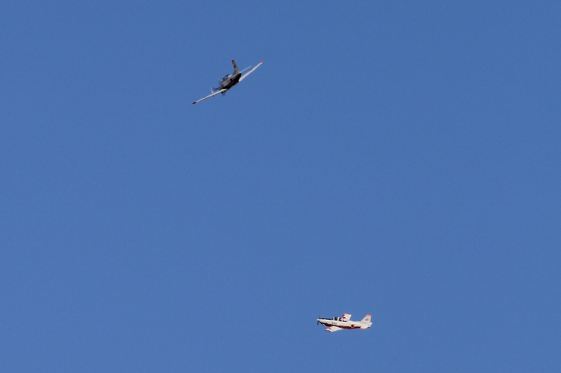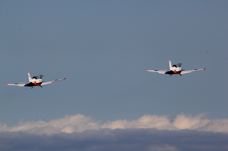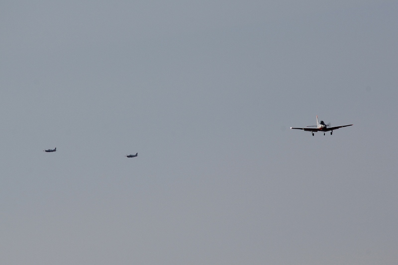 ソロ機の離陸を上空で見守っていた教官機がソロ機にぎゅわ~んとヒネり込みジョインします